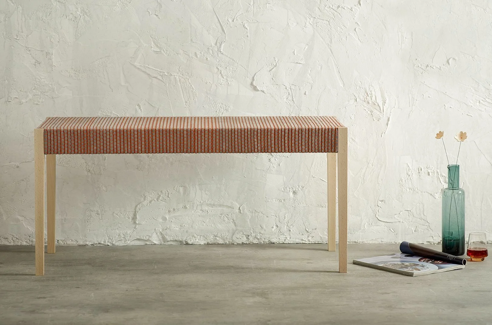ARNE is an elegantly handcrafted beech bench covered in DATA, a handwoven textile made from cotton and hand cut leather. The leather weft is hand cut from eco suede, a thick quality leather which gives a three dimensional effect to the weave.